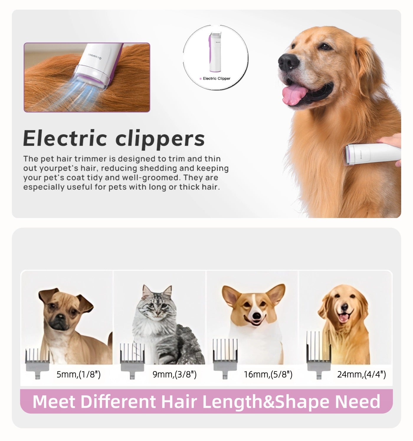 When trimming with the electric clipper, you can choose from four guide combs (3mm, 9mm, 16mm, 24mm), perfect for grooming dogs, cats, and other pets with different hair lengths.